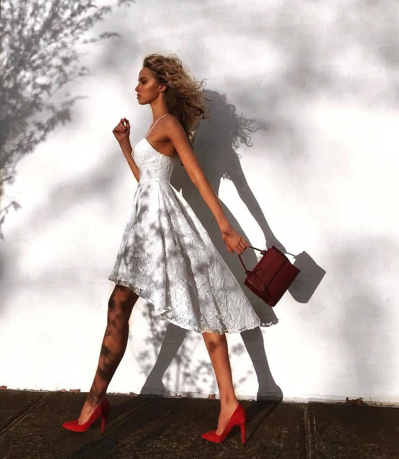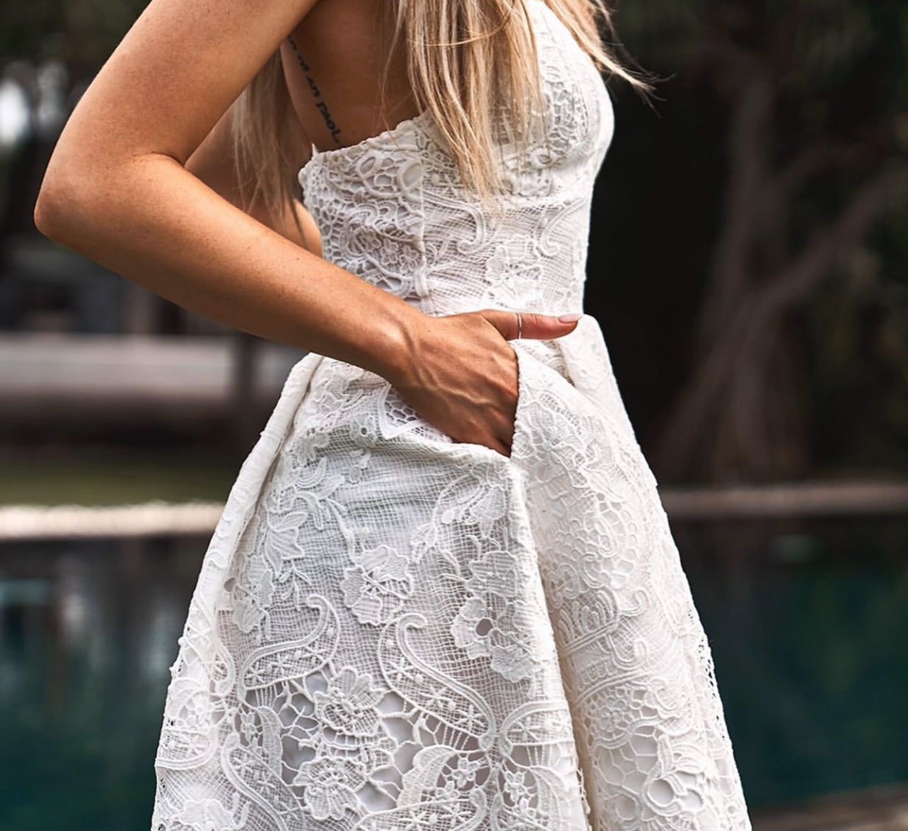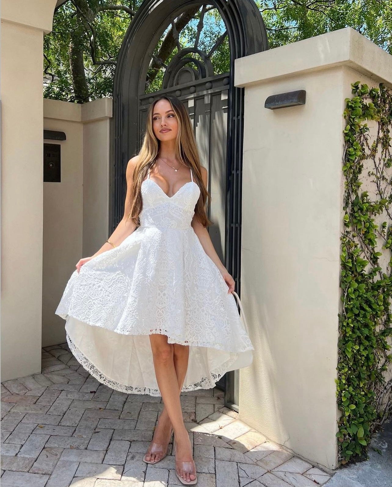The Marilyn Dress in White is gorgeous, it features a v neckline with adjustable straps and a high low hem. It has an exposed zipper at the center back with 2 functional side pockets. It has thick lining and a gorgeous lace overlay.